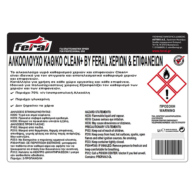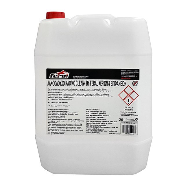 Το αλκοολούχο καθαριστικό χεριών και επιφανειών Clean+ By Feral 20lt είναι κατάλληλο για το στιγμιαίο και αποτελεσματικό καθαρισμό των χεριών και τη διατήρηση της υγιεινής.