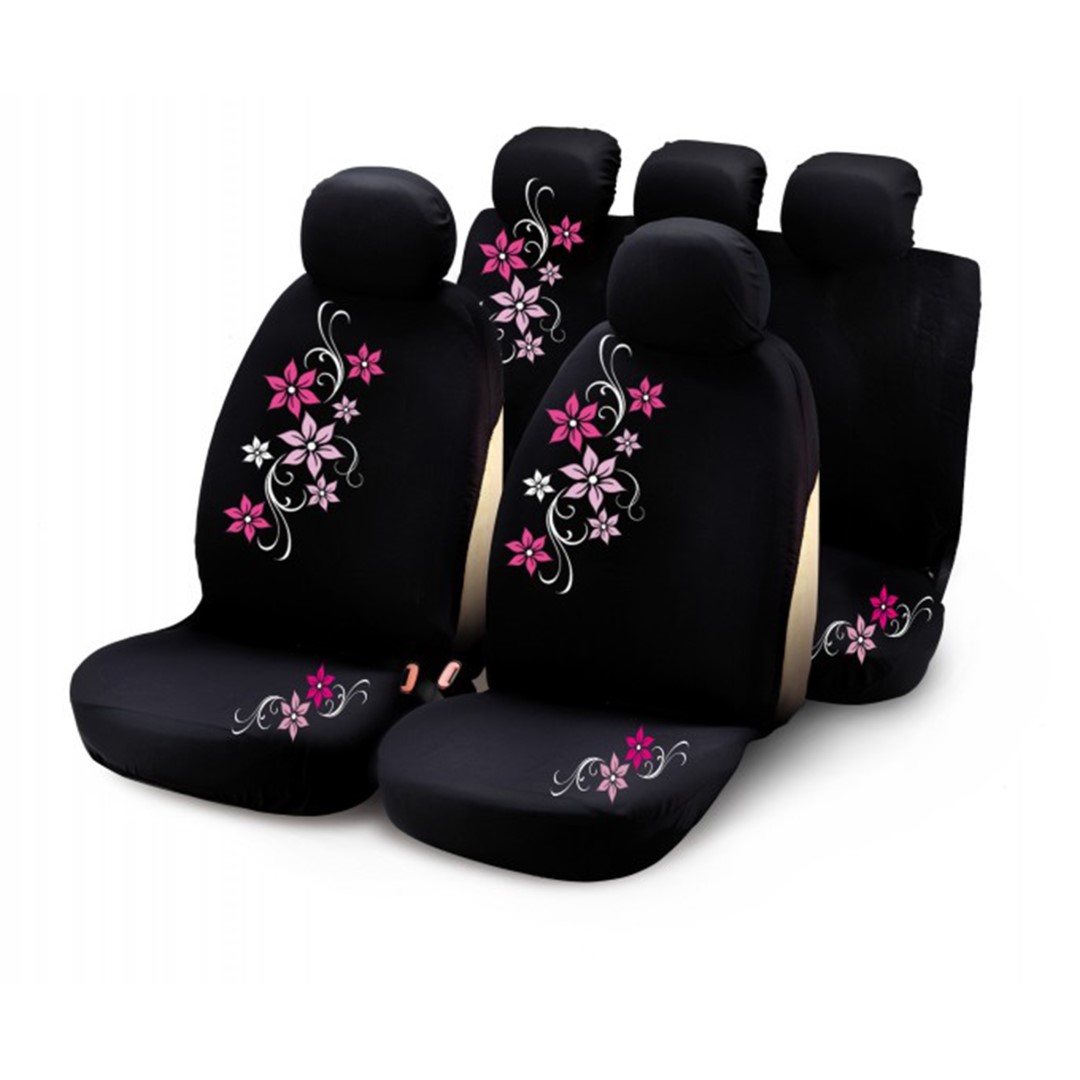 Ολοκληρωμένο σετ με καλύμματα καθισμάτων αυτοκινήτου MY STAR της σειράς REVOLUTION GIRL – GLAM GENERATION από την εταιρία BOTTARI, ιταλικής προελεύσεως, άριστης ποιότητας, εξαιρετικής εφαρμογής, κατασκευασμένα από πολυεστέρα (polyester) με επένδυση από μαλακό αφρώδες υλικό (μαξιλαράκι) πάχους 2 mm σε μαύρο χρώμα με ροζ λεπτομέρειες και floral σχέδιο (λουλούδια).