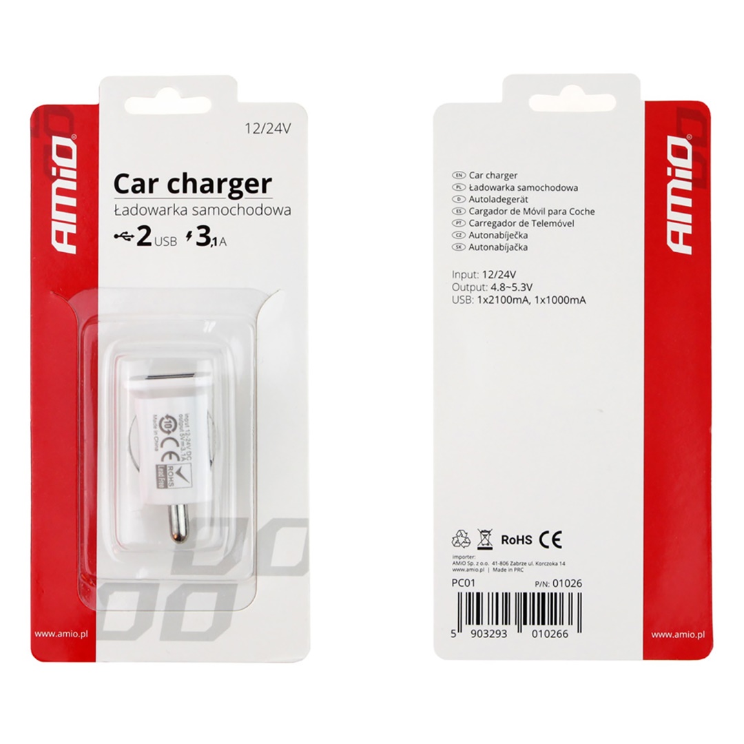 Φορτιστής για την υποδοχή αναπτήρα του οχήματός σας με 2 θύρες USB, πολωνικής προέλευσης από την εταιρία Amio. Ιδανικό προϊόν για να φορτίζετε έως και 2 συσκευές ταυτόχρονα (smartphone, κινητό τηλέφωνο, GPS, Tablet κ.α) και για οχήματα με τάση 12/24v.