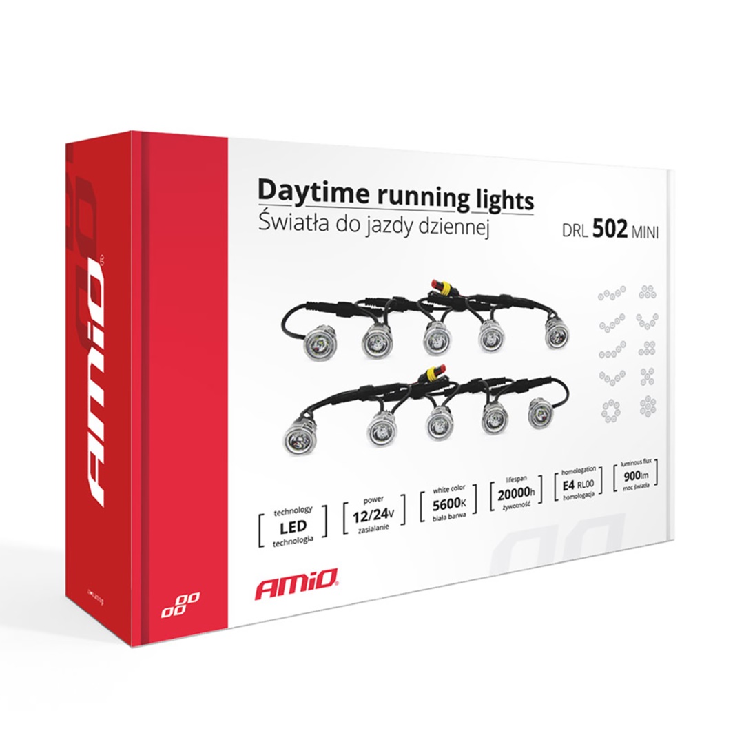 Φώτα ημέρας DRL πολωνικής προέλευσης από την εταιρία Amio, κατάλληλα για οχήματα με τάση 12/24v. Ιδανικό προϊόν για τοποθέτηση στο κάτω μέρος του προφυλακτήρα του οχήματος σε μορφή στρογγυλών led που μπορούν να τοποθετηθούν διαδοχικά.