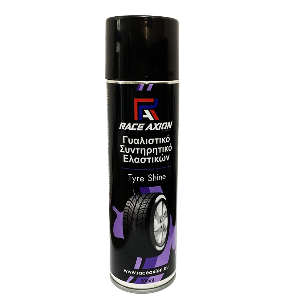 Γυαλιστικό και συντηρητικό σπρέι, κατάλληλο για όλους τους τύπους ελαστικών, από την εταιρία RACE AXION, ελληνικής προέλευσης, σχεδιασμένο με ειδικά συστατικά που μεταμορφώνουν τα ελαστικά, επαναφέρουν το αρχικό χρώμα του ελαστικού και χαρίζουν λάμψη με ένα ψέκασμα.