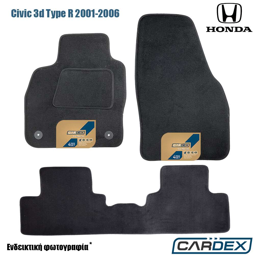 Πατάκια αυτοκινήτου Honda Civic 3θυρο Type-R 2001-2006 μαρκέ μοκέτα μαύρη, ποιότητας Velourtec™ και κουμπώματα στον οδηγό, από την εταιρία Cardex®