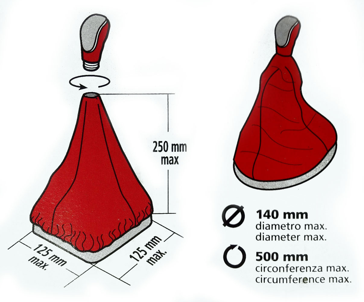 Φούσκα ταχυτήτων από συνθετικό δέρμα εξαιρετικής ποιότητας με κορδόνι και velcro στο επάνω μέρος της για να γίνεται άριστη η εφαρμογή με το πόμολο. Το χρώμα της είναι μαύρο με κόκκινη ραφή και η φούσκα είναι κατάλληλη για πλαίσιο ταχυτήτων με μέγιστη περίμετρο 500 mm ή με μέγιστη διάμετρο 140 mm, ύψος 250 mm και μήκος / πλάτος βάσης πλαισίου: 125 x 125 mm. Κατάλληλη φούσκα για συμβατούς μοχλούς ταχυτήτων αλλά και για μοχλό που διαθέτει επιλογέα ταχυτήτων με ανύψωση ή μετατόπιση (σηκωτή ή πατητή όπισθεν).