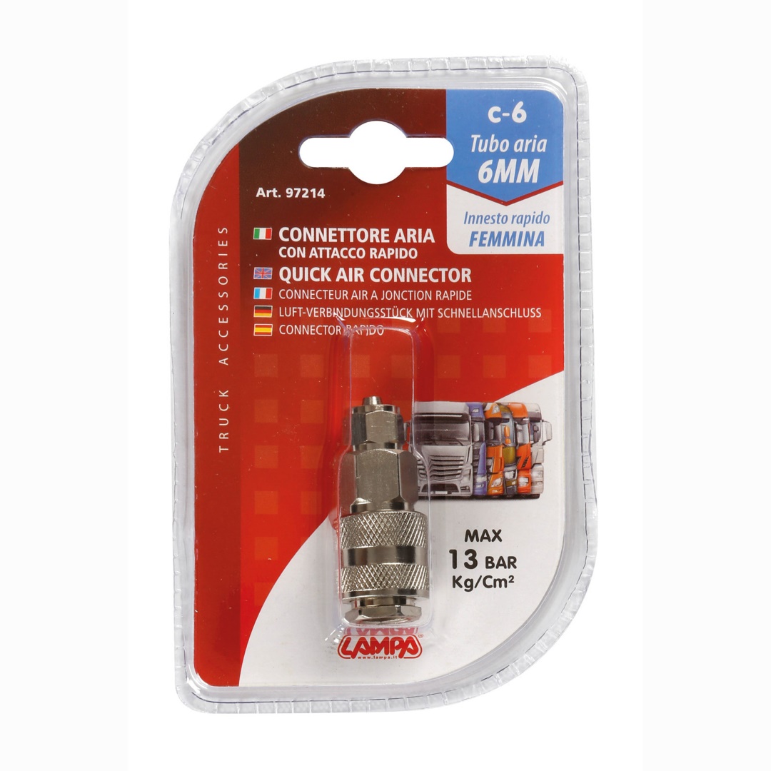 Σύνδεσμος θηλυκός από την εταιρία Lampa, ιταλικής προέλευσης, κατάλληλος για τοποθέτηση στην ήδη υπάρχουσα υποδοχή της καμπίνας του φορτηγού, συνδέοντας πιστόλι αέρα για τον αποτελεσματικό καθαρισμό του εσωτερικού χώρου του οχήματος από την σκόνη και την βρωμιά. Ιδανικό αξεσουάρ για φορτηγά και νταλίκες.
