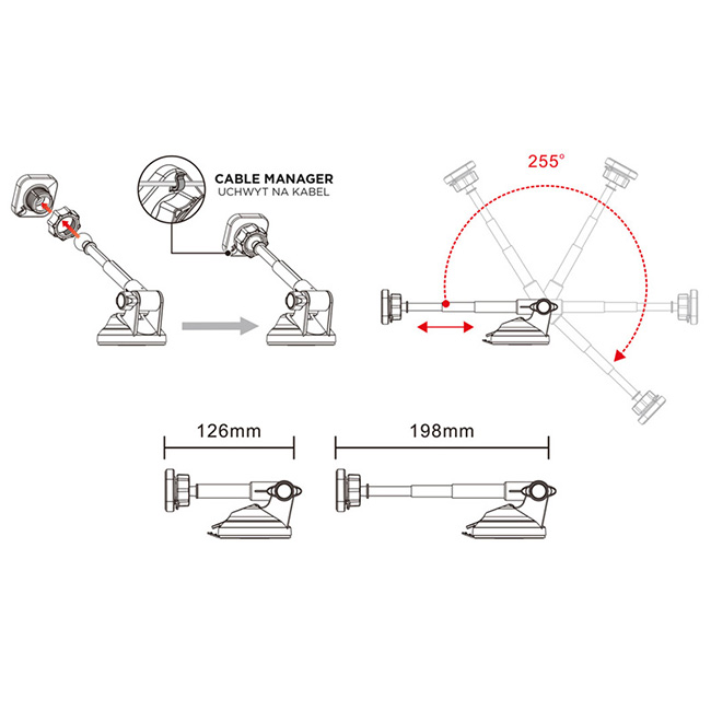 Η βάση στηρίζεται με βεντούζα, άρα μπορεί να τοποθετηθεί στο ταμπλό ή το παρμπρίζ του αυτοκινήτου.