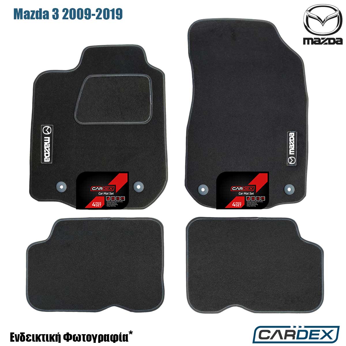 Πατάκια αυτοκινήτου Mazda 3 2009-2019 μαρκέ μοκέτα μαύρα με λογότυπο ποιότητας Eco-Line και κουμπώματα στον οδηγό και τον συνοδηγό, από την εταιρία Cardex®