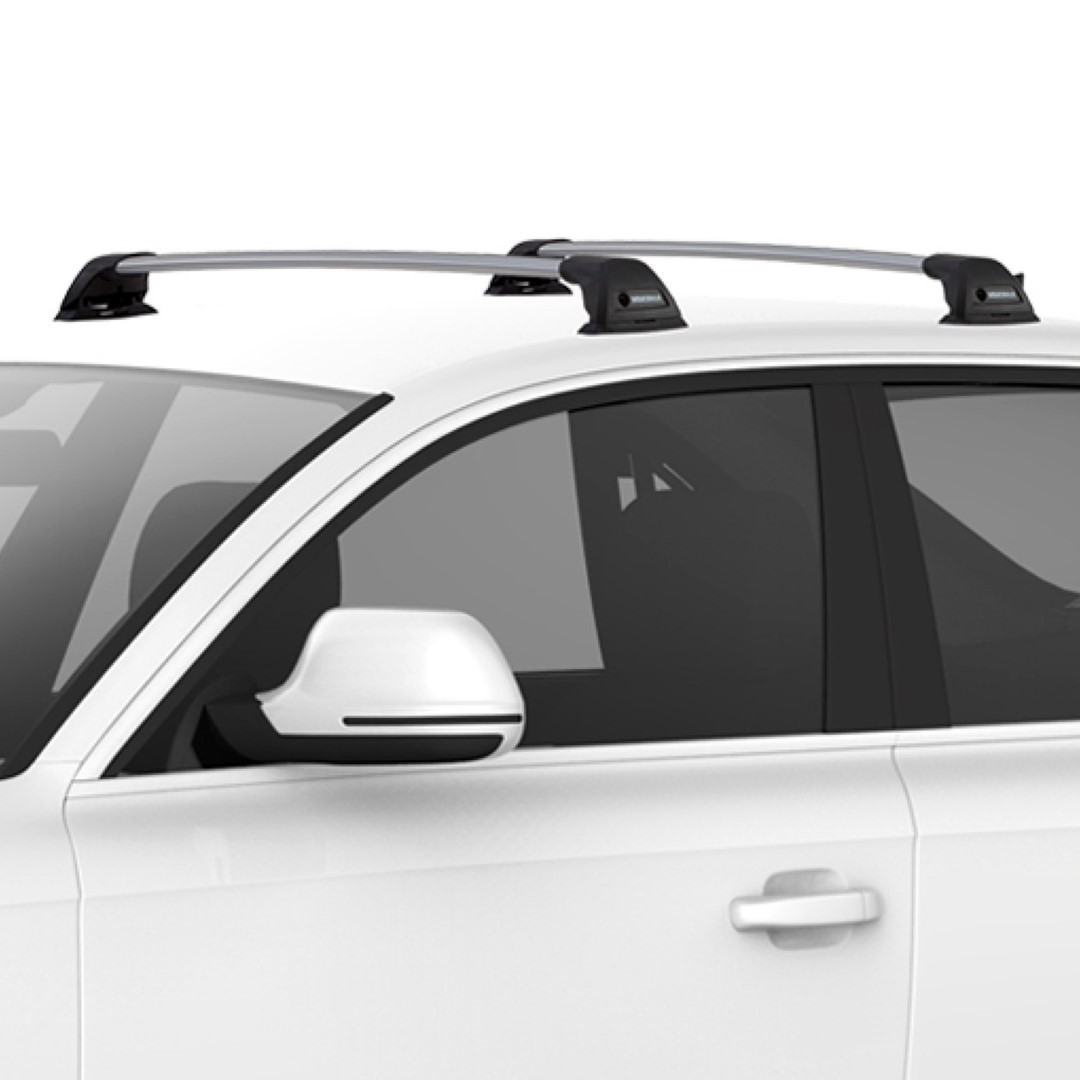 Μπάρες οροφής FLUSH BAR από την εταιρία YAKIMA, αμερικανικής προέλευσης, σε ασημί χρώμα με μαύρες λεπτομέρειες, κατάλληλες για όλους τους τύπους οροφής (απλή, με fix points, με standard railing, με flush railing, με νεροχύτη/υδρορροή ή κανάλια) χάρις στον καινοτόμο και εργονομικό σχεδιασμό τους. Καινοτόμες, μοντέρνες, πρακτικές με ιδιαίτερη αισθητική και στυλ, συνδυάζονται άψογα με το design του οχήματός σας προσδίδοντας πολυτέλεια και δημιουργώντας μια κομψή αλλά παράλληλα sport σιλουέτα. Ανήκουν στη κατηγορία MIXED, έχουν διαφορετικό μήκος (κατά 5 cm) για εφαρμογή σε ανισομερείς οροφές, χωρίς να προεξέχουν καθόλου από το προφίλ (πλάγια της οροφής) του οχήματος.